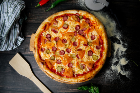 Пицца - настоящая итальянская, ручного приготовления. Мы не используем электрические прессы, замороженную основу и прочее. Только ручной труд, только тонкое тесто и хрустящая корочка. Выпекаем на камне за 7 минут!